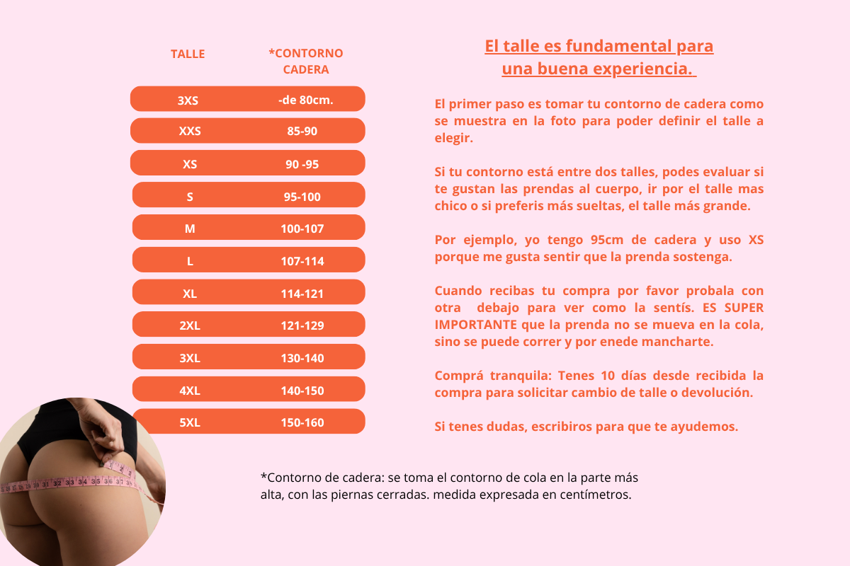 Medí tu contorno de cadera (piernas cerradas y centímetro en la parte más alta de la cola) y validá con nuestra guía . La bombacha debe quedarte al cuerpo, ni muy ajustada ni suelta.